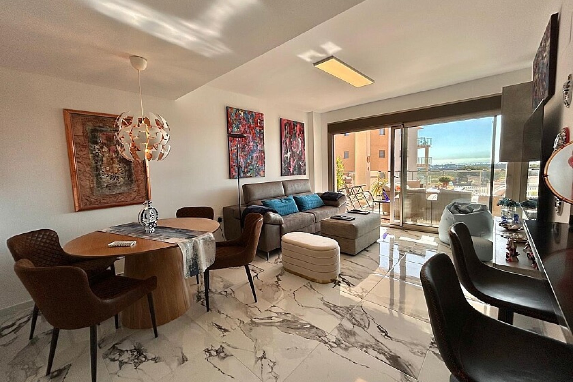 Located on the second floor of a modern, gated urbanization, the apartment boasts 82 m² of interior space, complemented by a generous 20 m² south-east facing terrace. From here, you can enjoy pleasant views toward La Zenia Boulevard and the sparkling coastline of Zenia Beach.
