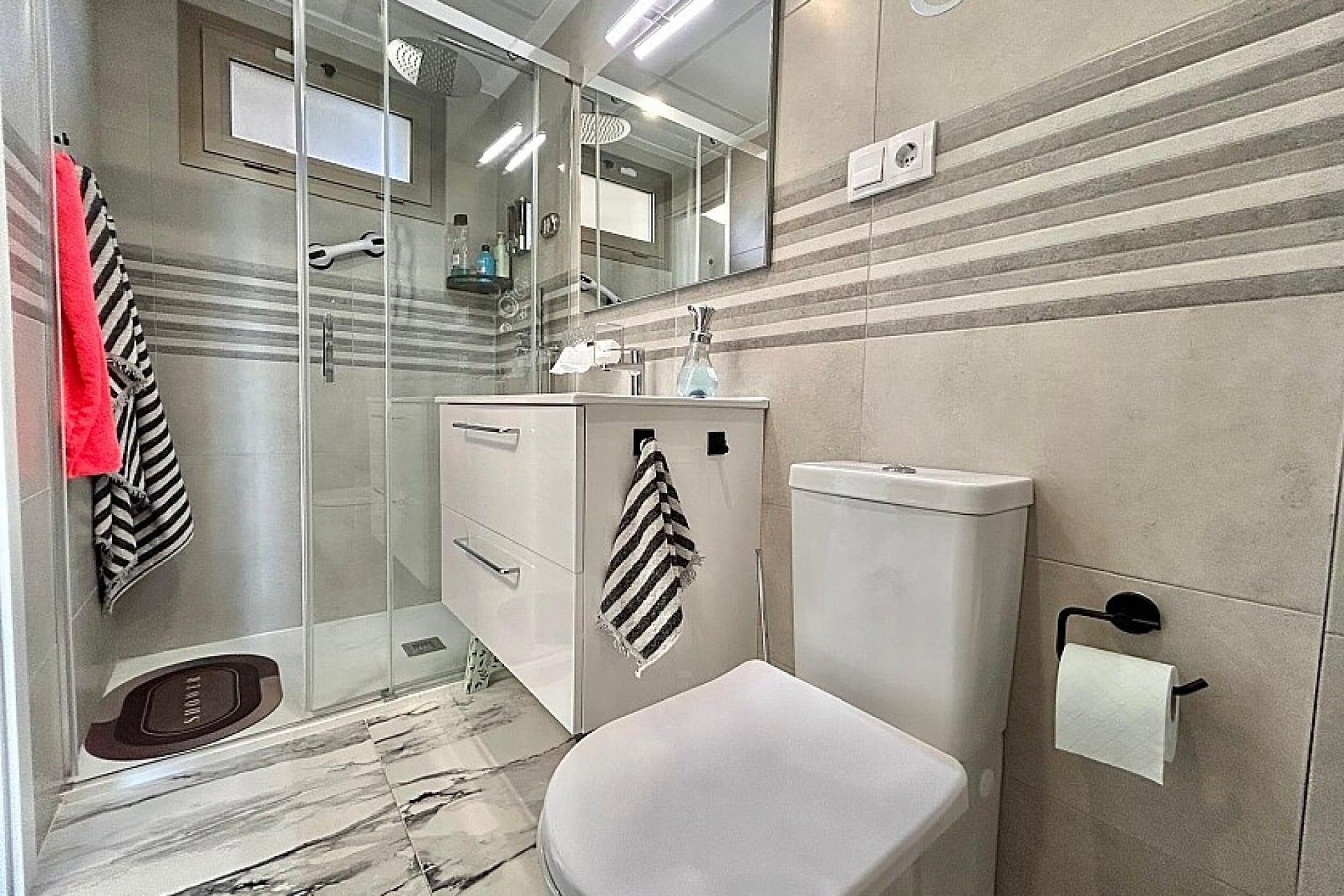The urbanization itself offers an impressive array of amenities designed to enhance your lifestyle. Enjoy beautifully landscaped gardens, a fitness and spa area, sports facilities, a children’s playground, and three communal swimming pools—one of them heated. A BBQ area, front terrace spaces, and communal zones for leisure make the complex ideal for families and visitors alike.